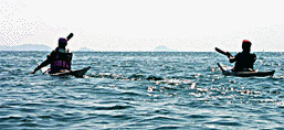 ストロークにおいてはオリエンタルスカリングと同じ円弧の外側へ押す力が推進力に加わります。 ただ、沈み込もうとするブレードを押さえなければなりませんので、独特のバランスの取り方が必要になります。これは押し手を下方向に押し込むのと同時に押し手側に上半身の重みを預けることで行います。手だけで押すのでなく、肩も一緒に押し込むようにするとわかりやすいかも知れません。また、自然なパドリングの場合は、不安定になったときリカバリーとして傾いた側にスウィープストロークやブレースストロークを入れますが、前傾パドリングの場合は逆になります。 もっとも、この漕法がナローパドルを使用していた全てのエスキモー・イヌイットやアリュートたちに存在していたかどうかは定かではありません。 |